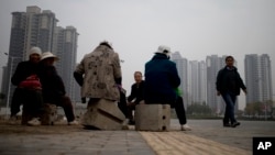 中国陕西西安一处新住宅楼附近一组农民工正在午间休息(资料照片 2013年11月6日)